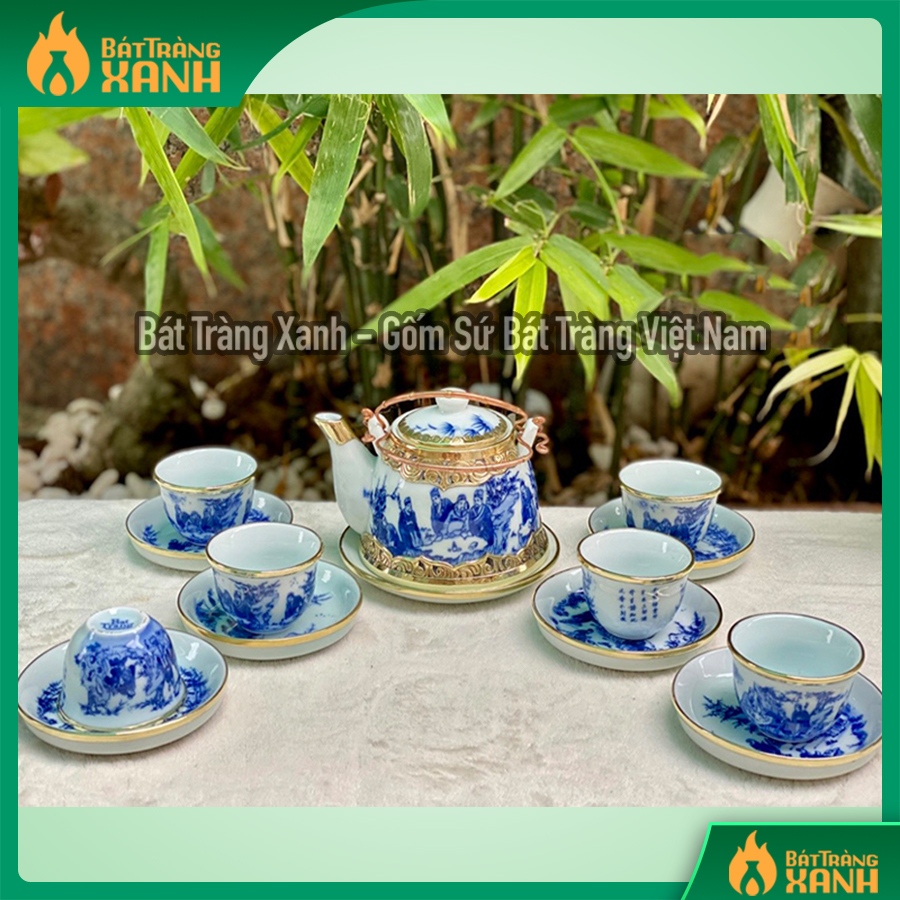 Bộ ấm chén Bát Tràng bọc đồng Trúc Lâm Thất Hiền vuốt