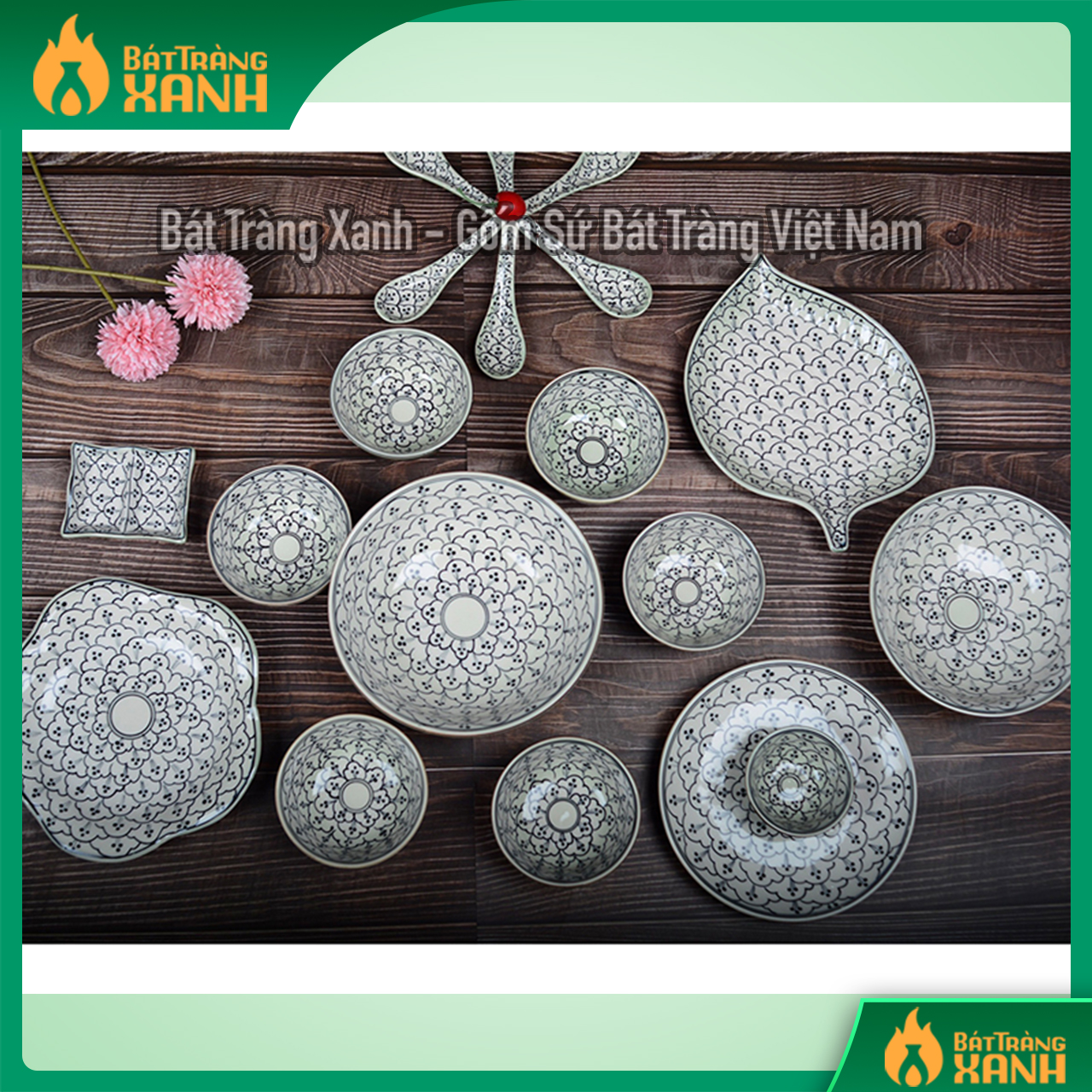 Bộ bát đĩa xanh đồng vẽ hoa bèo 19 sản phẩm
