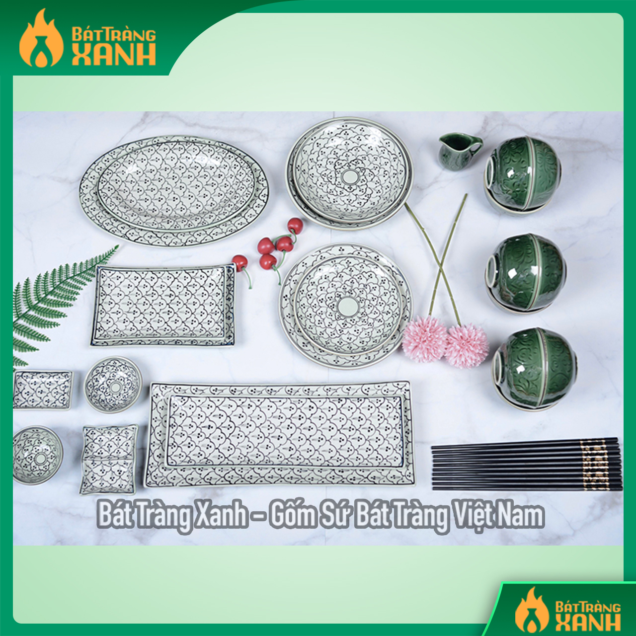 Bộ bát đĩa xanh đồng vẽ hoa bèo 24 sản phẩm