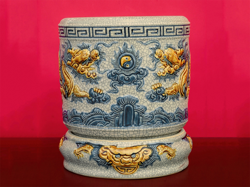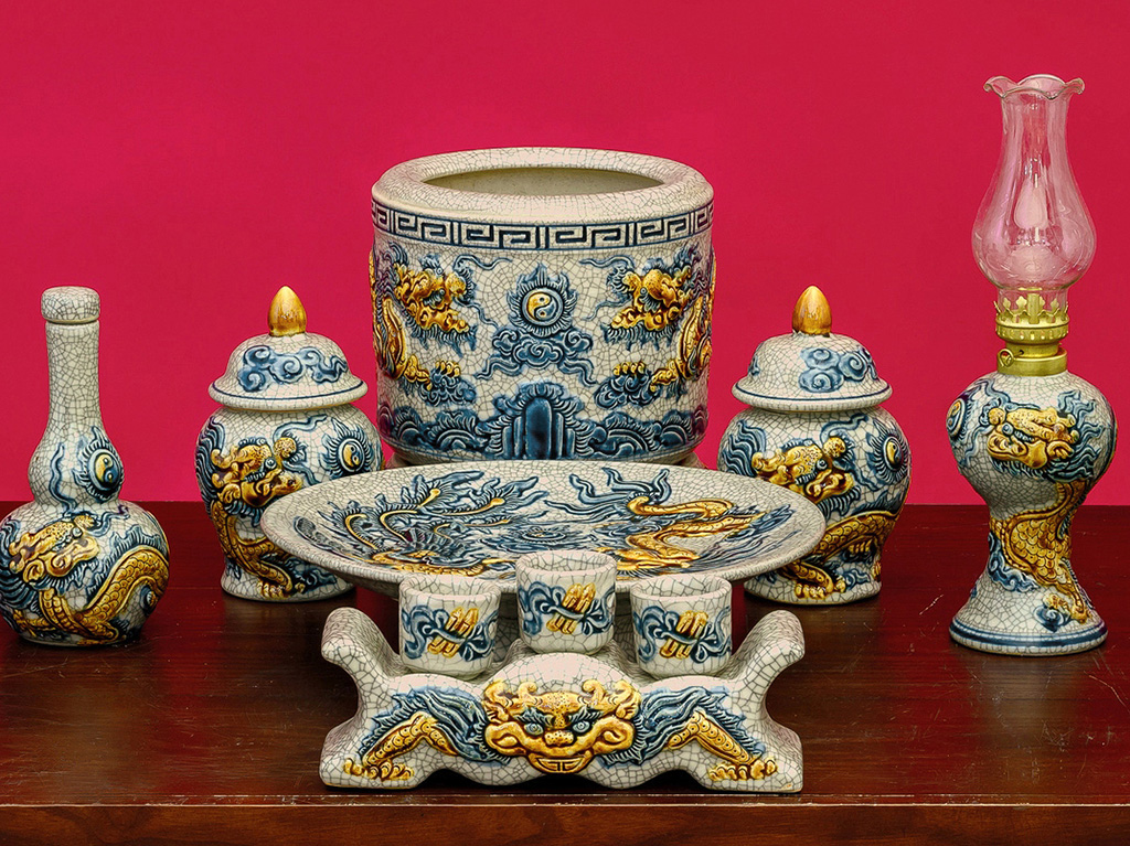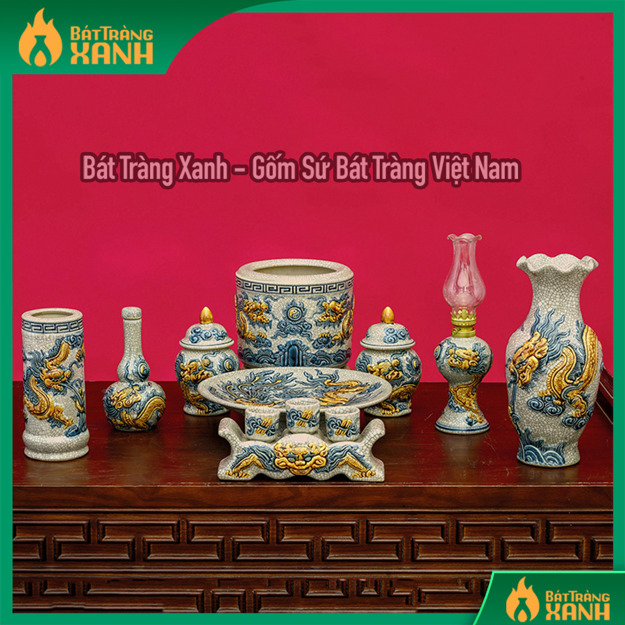 Đồ thờ cúng không chỉ mang ý nghĩa tâm linh mà còn thể hiện lòng thành tâm hiếu nghĩa của con cháu đến tổ tiên, cội nguồn. Vì vậy việc chọn lựa bộ đồ thờ cao cấp, chất lượng tốt luôn được mọi gia đình quan tâm và sử dụng. Hãy cùng Bát Tràng Xanh tìm hiểu về Bộ đồ thờ Bát Tràng men rạn đắp nổi rồng bàn thờ 1.27m nhé.