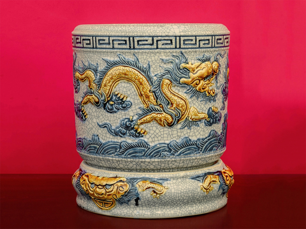 Họa tiết rồng đắp nổi thủ công, hoa văn tỉa từng chi tiết nhỏ thể hiện sự tinh tế của người thợ tay nghề lâu năm.