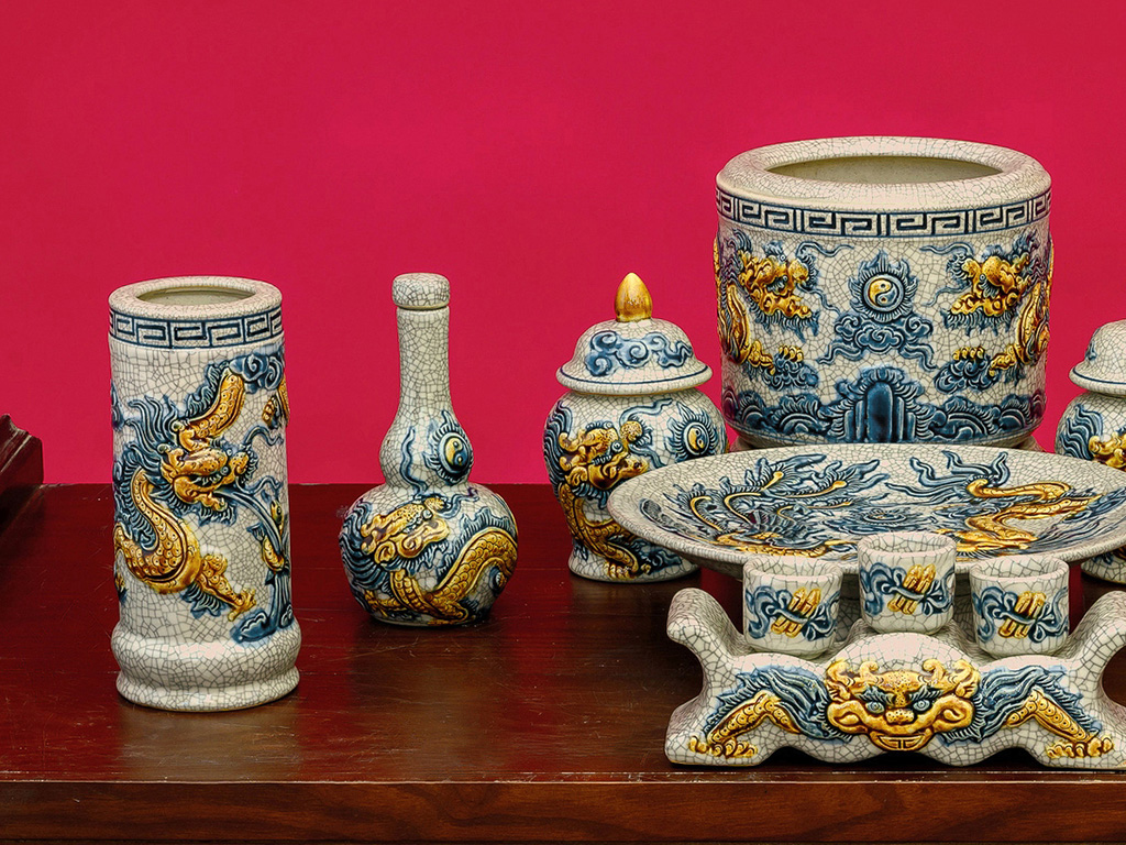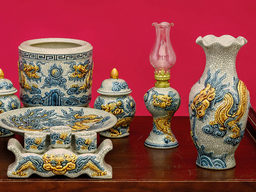 Bộ đồ thờ Bát Tràng men rạn đắp nổi rồng bàn thờ 1.27m hứa hẹn sẽ là một trong những là bộ đồ thờ đẹp và phù hợp nhất với nhiều gia đình Việt.